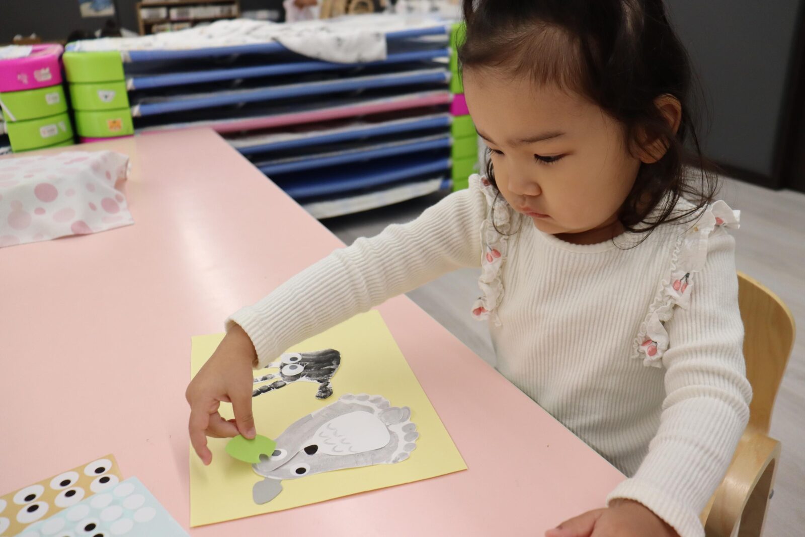 はな組さんの製作の様子です(*^^*) 手形・足形アートを作りました~👀✨ 目をつけて、もみじやイチ