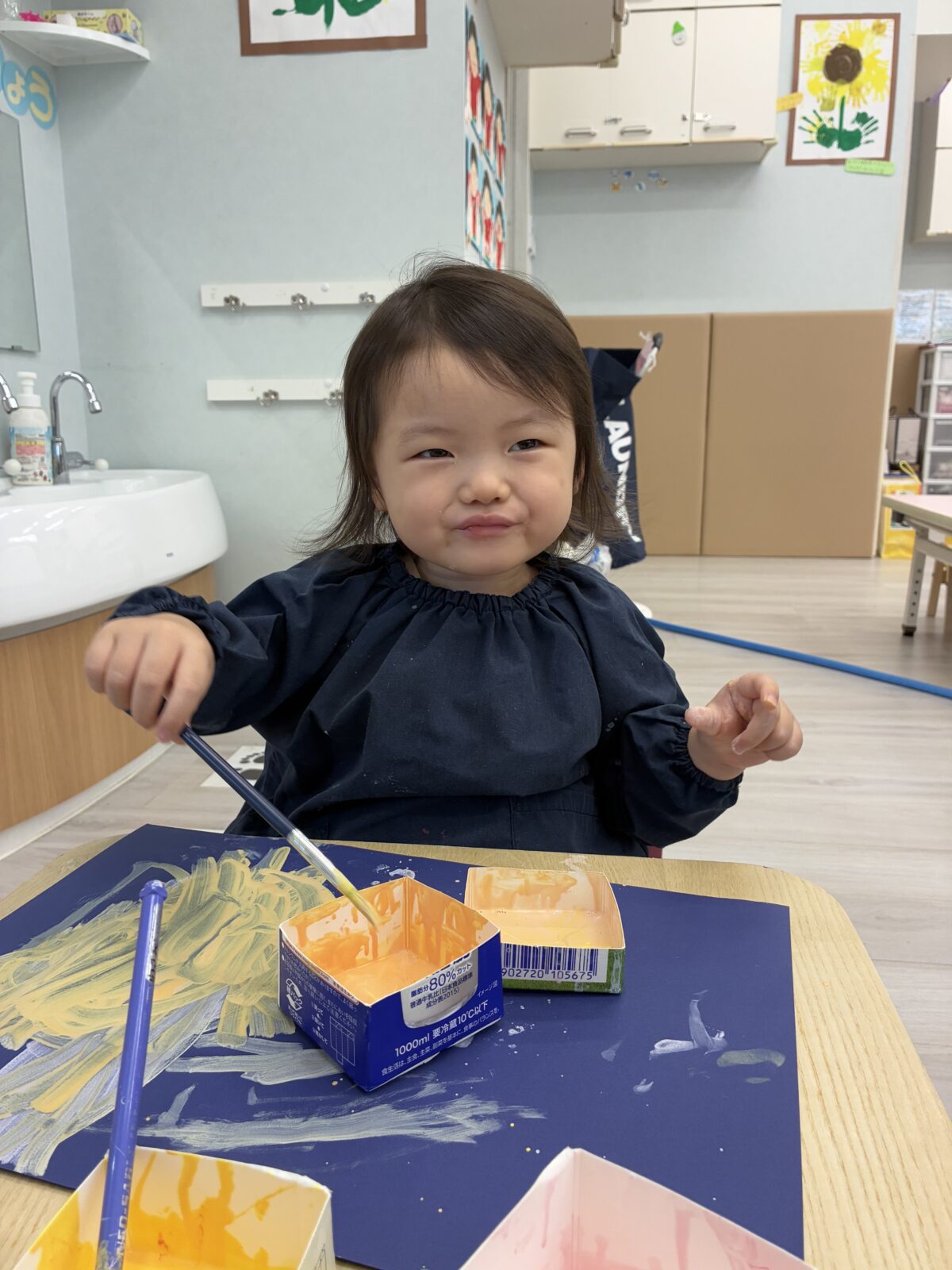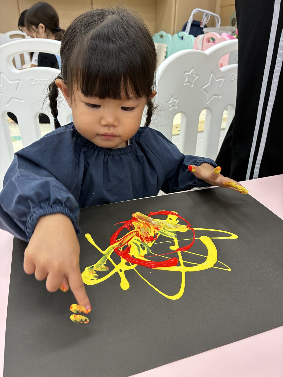 ちゅうりっぷ組さんの製作の様子です✨😊 指先や手のひらを使って描いてくれました♬ 最初は指先だけを使…