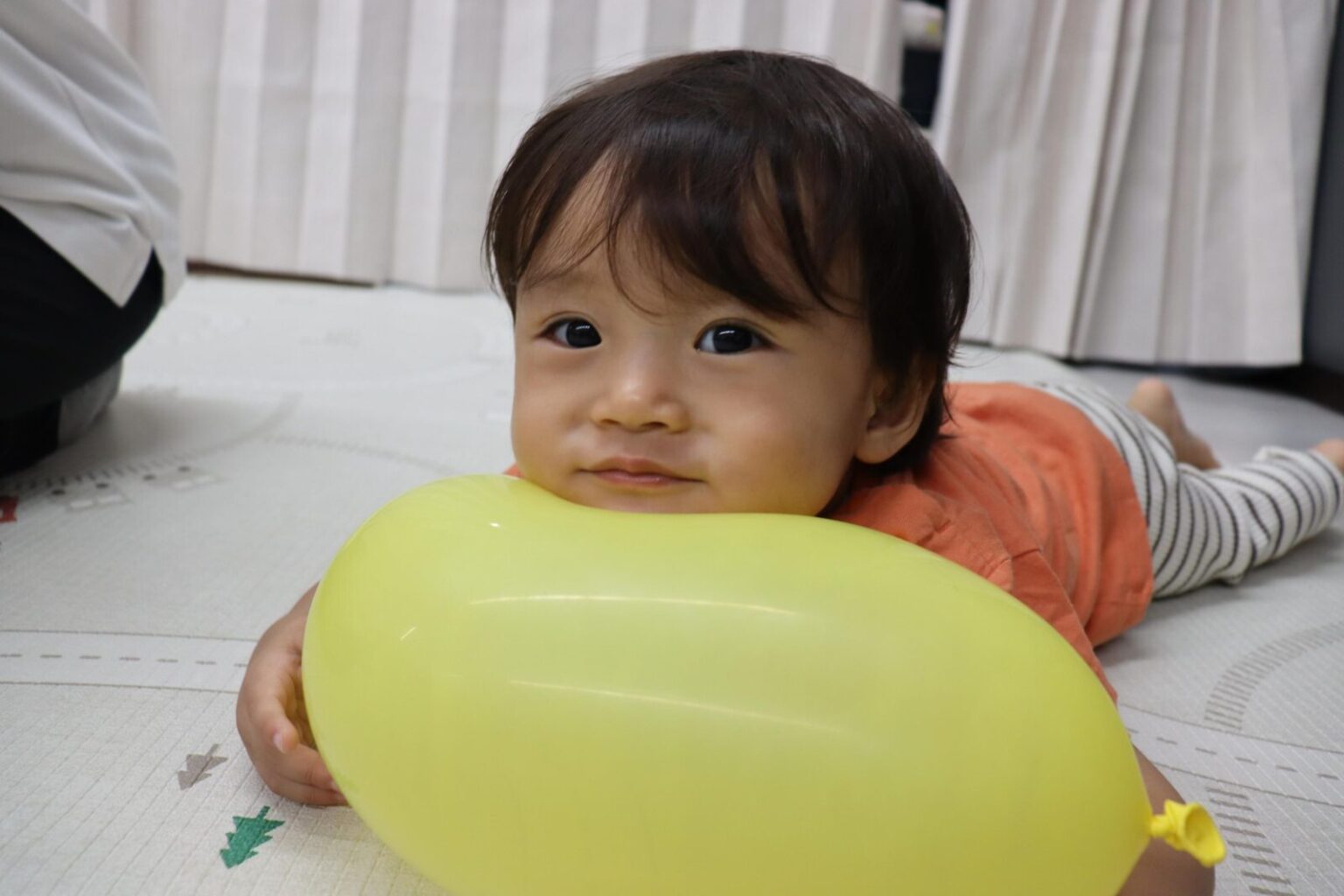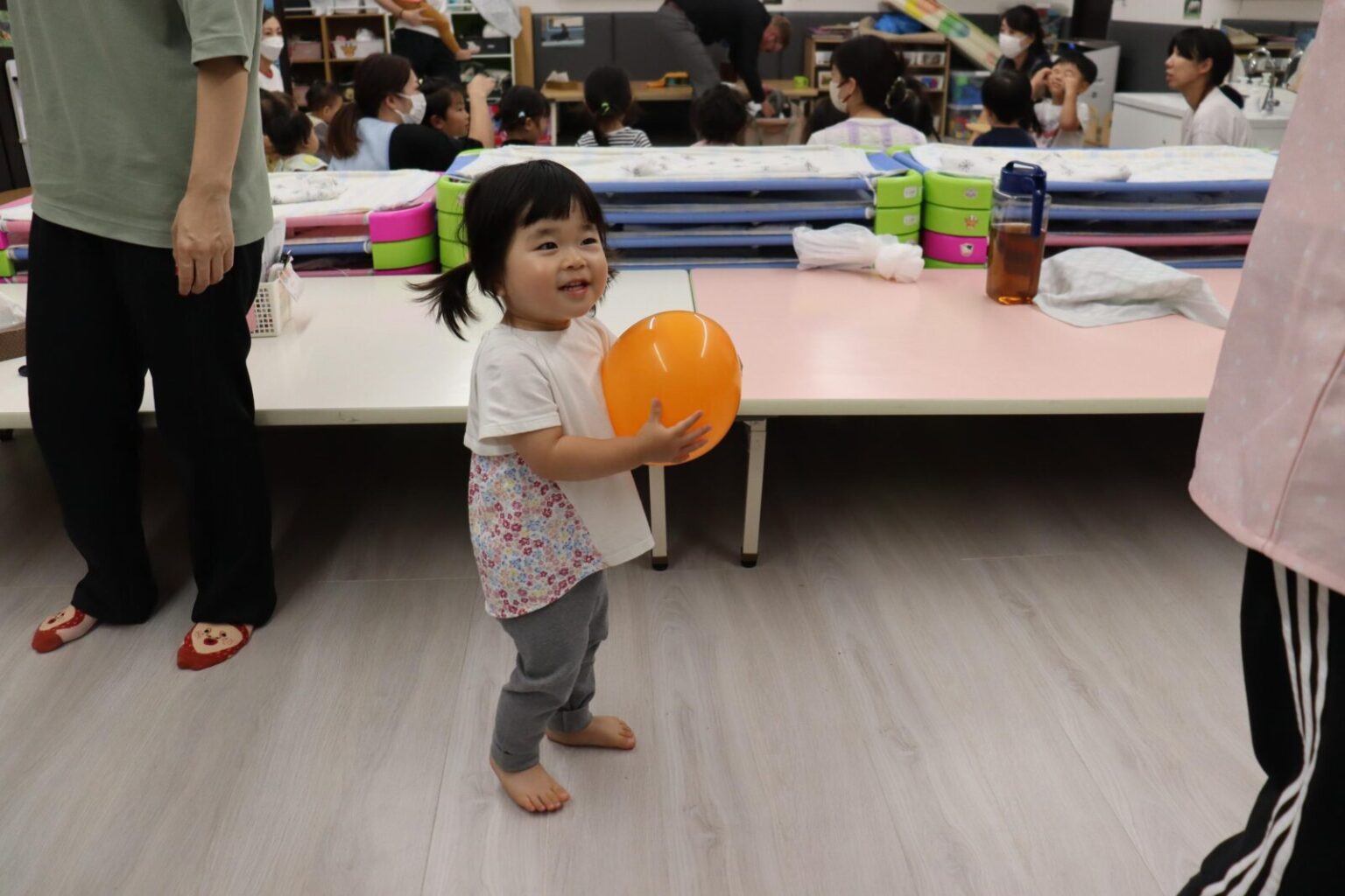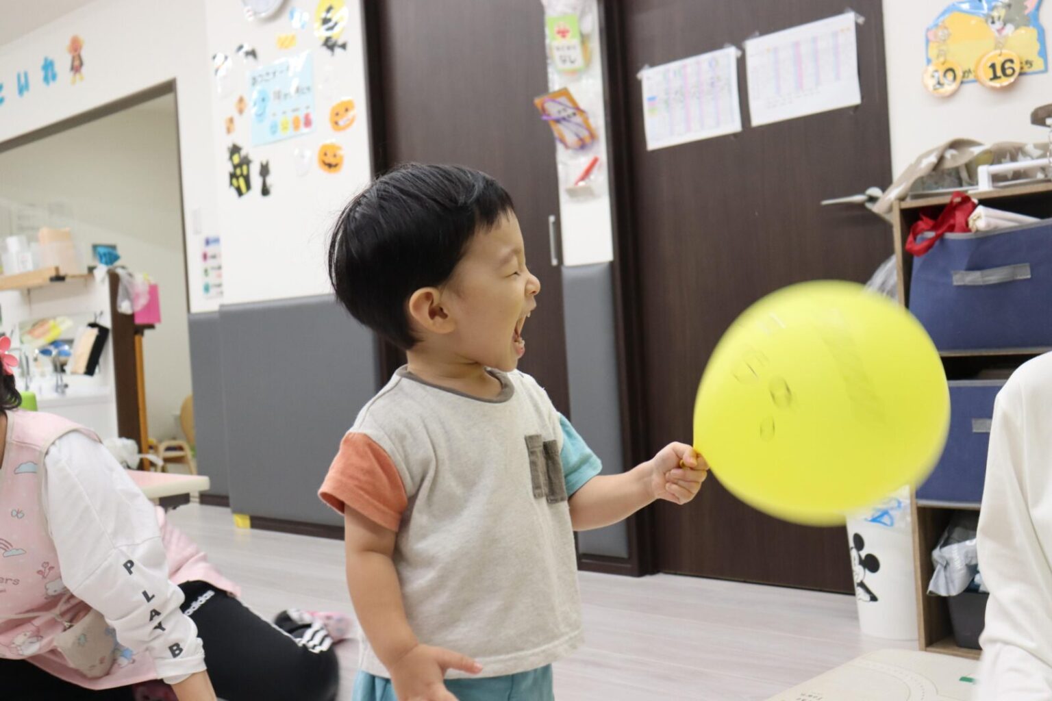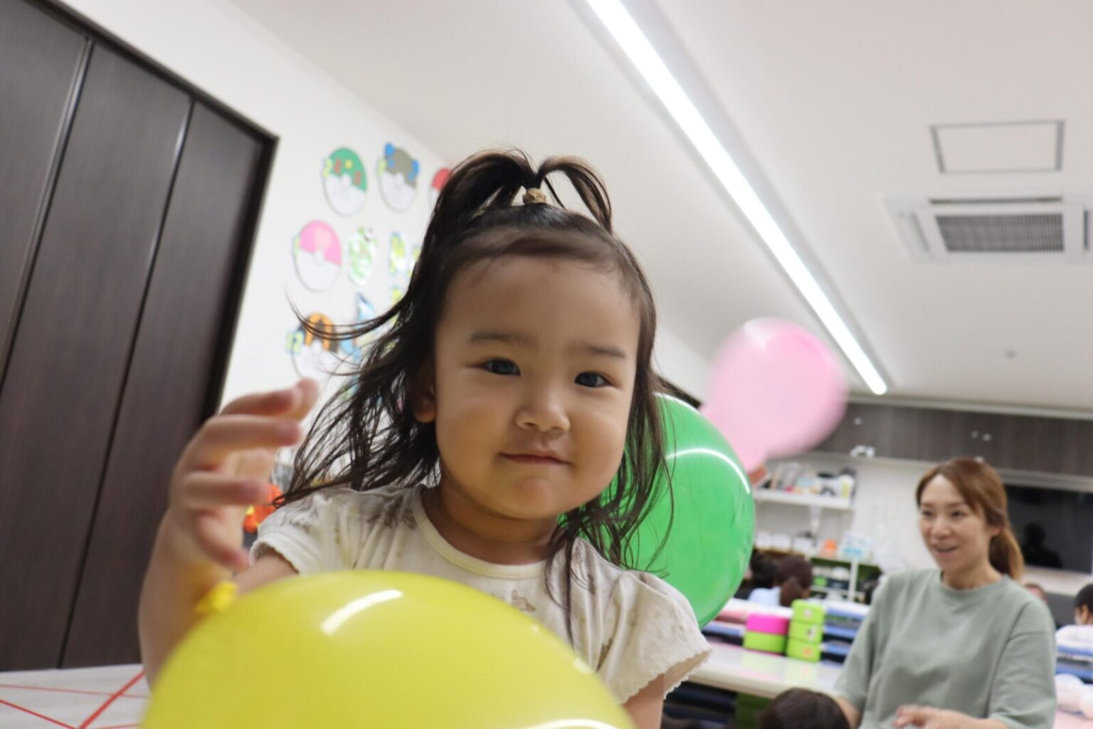 いろいろな形の風船やお顔の書いた風船を見つけて、手の上でポンポンはじいたり、追っかけたりして楽しんでいました~✨