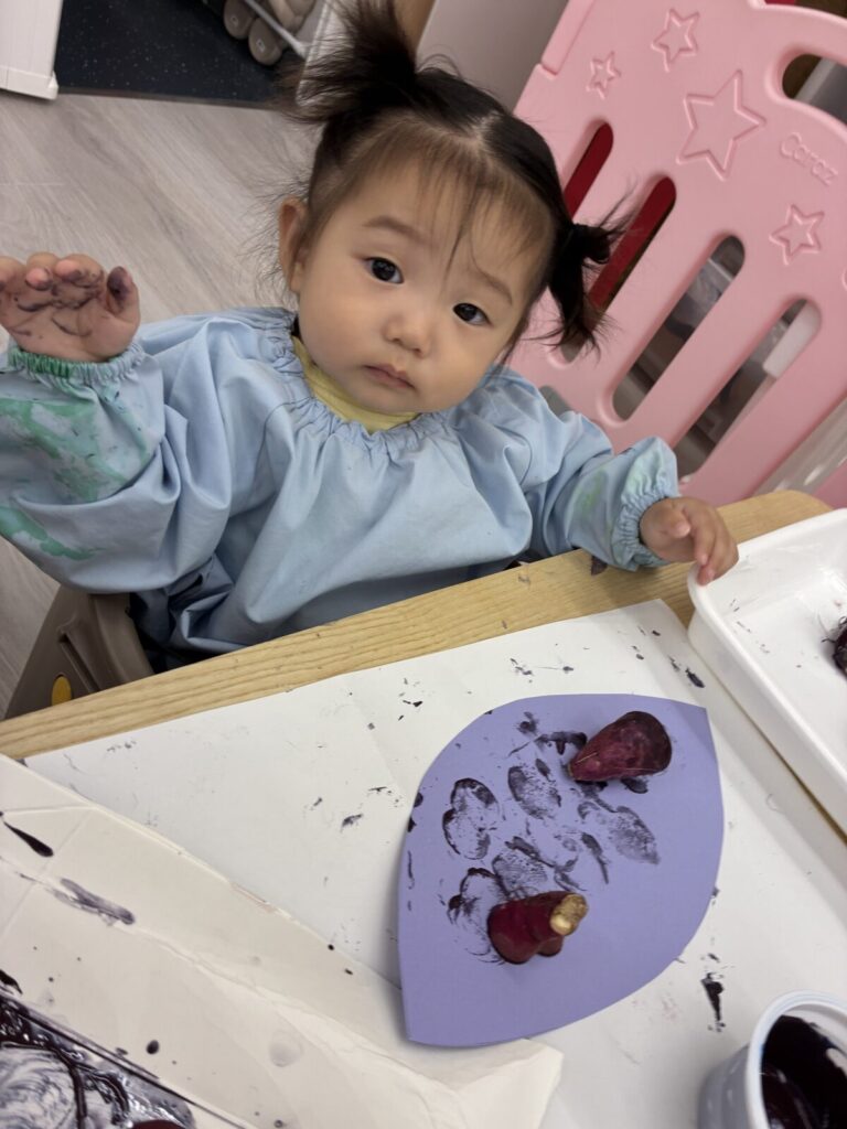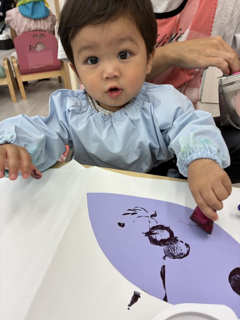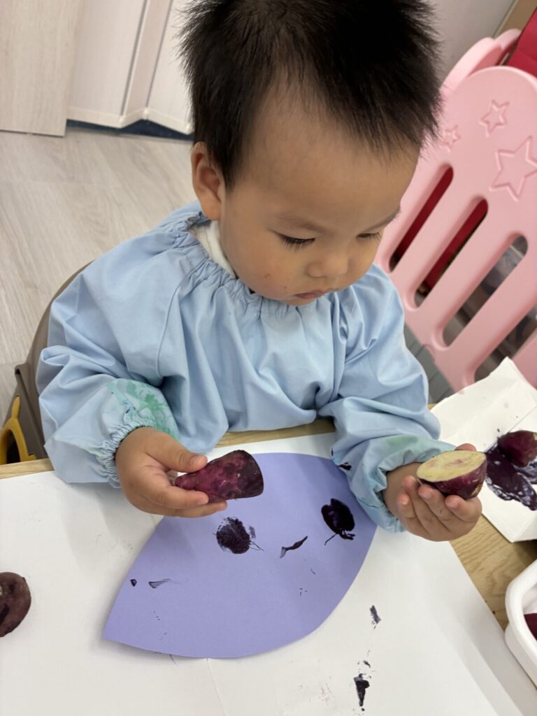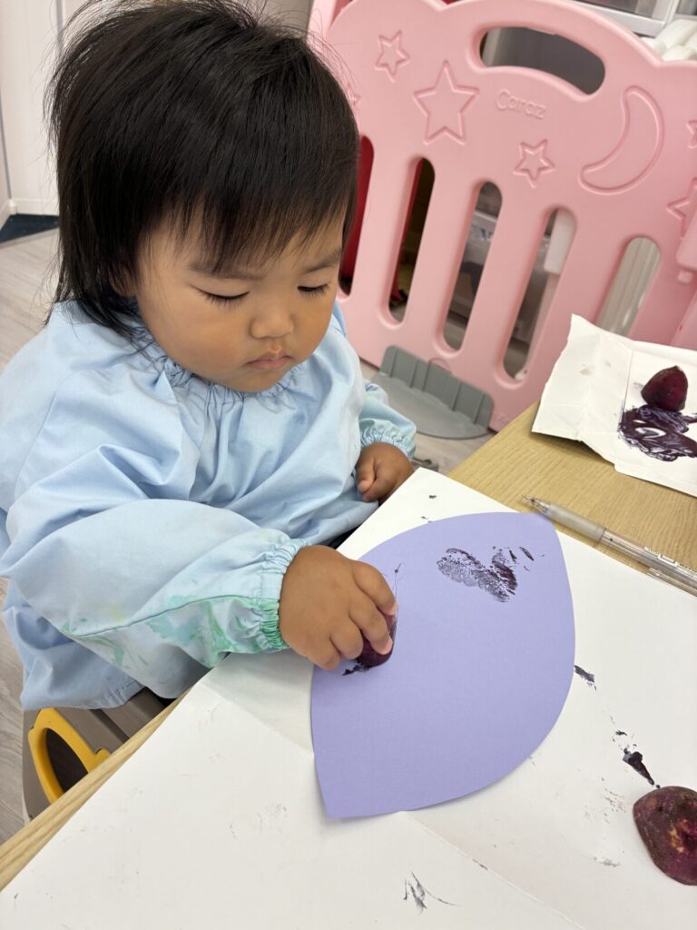 絵の具を塗って、不思議そうにさつまいもを見ている子どもたち✨😊