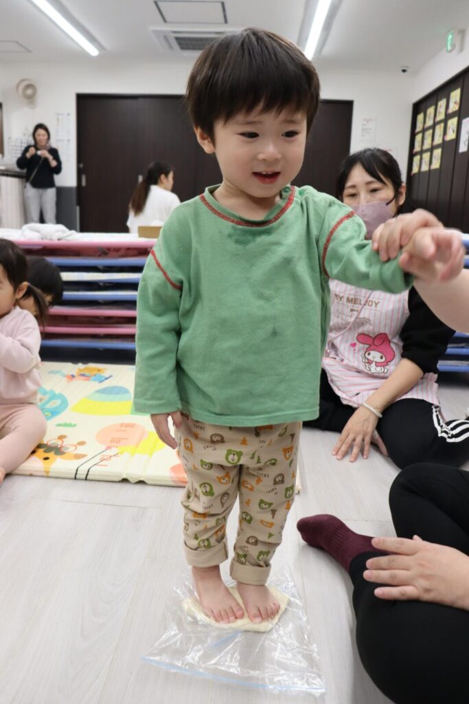 まずは、順番に生地を足で踏んでいきます👣
