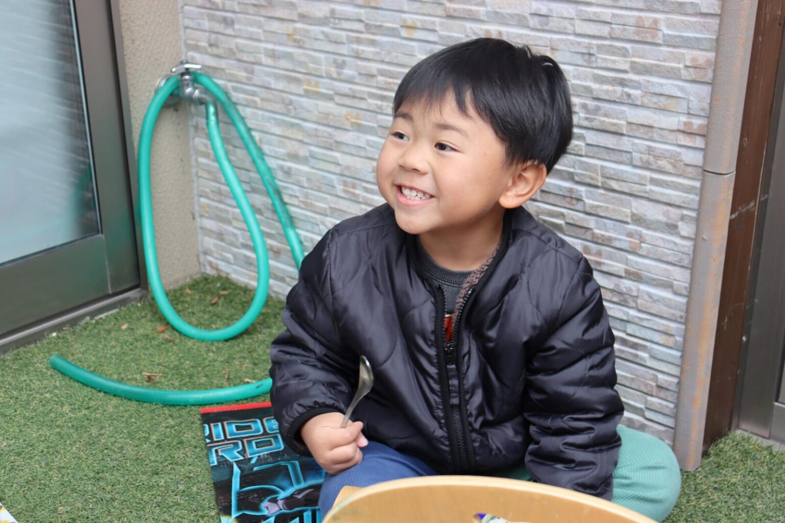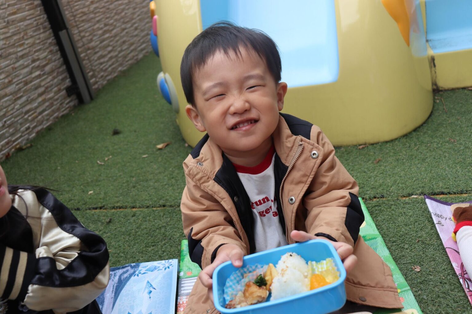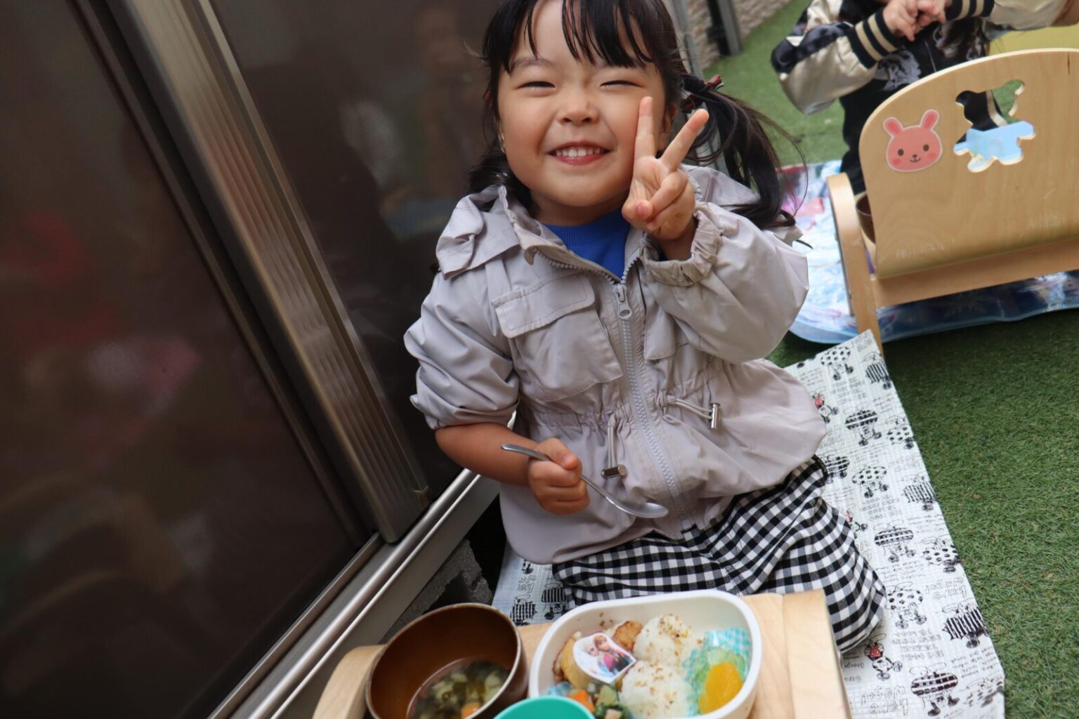 園庭にシートを敷き、輪になってお弁当箱に詰めた給食を食べました~🍴