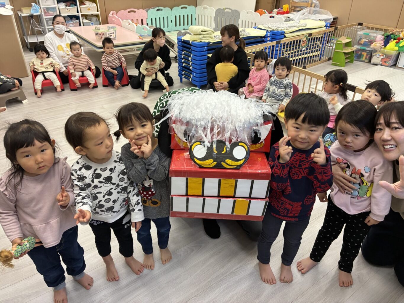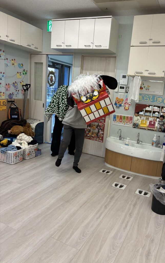 先生が獅子舞は怖くないよ!頭を噛んでもらうと健康に過ごせるんだよ~!とお話してくれました✨