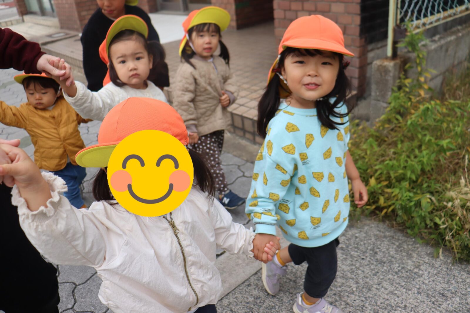 お散歩会の様子です🍂 ほし組さんとはな組さんは、お手手を繋いで出発~👣 公園の広場に着くと、全クラス