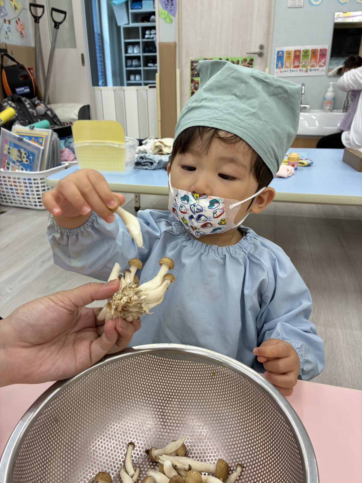 ちゅうりっぷ組さんの食育の様子です♪ 今回はしめじを割いてもらいました🍄♡ 今日使うのはどのキノコか