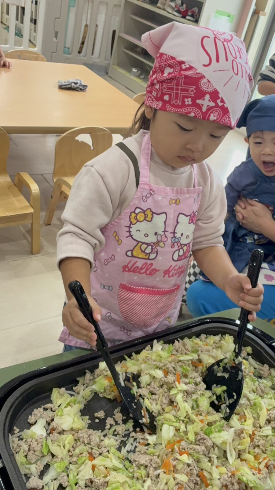 うさぎ組さんでクッキングがありました✨ この日は焼きそばパンつくりをしました🎵 みんなでキャベツをち