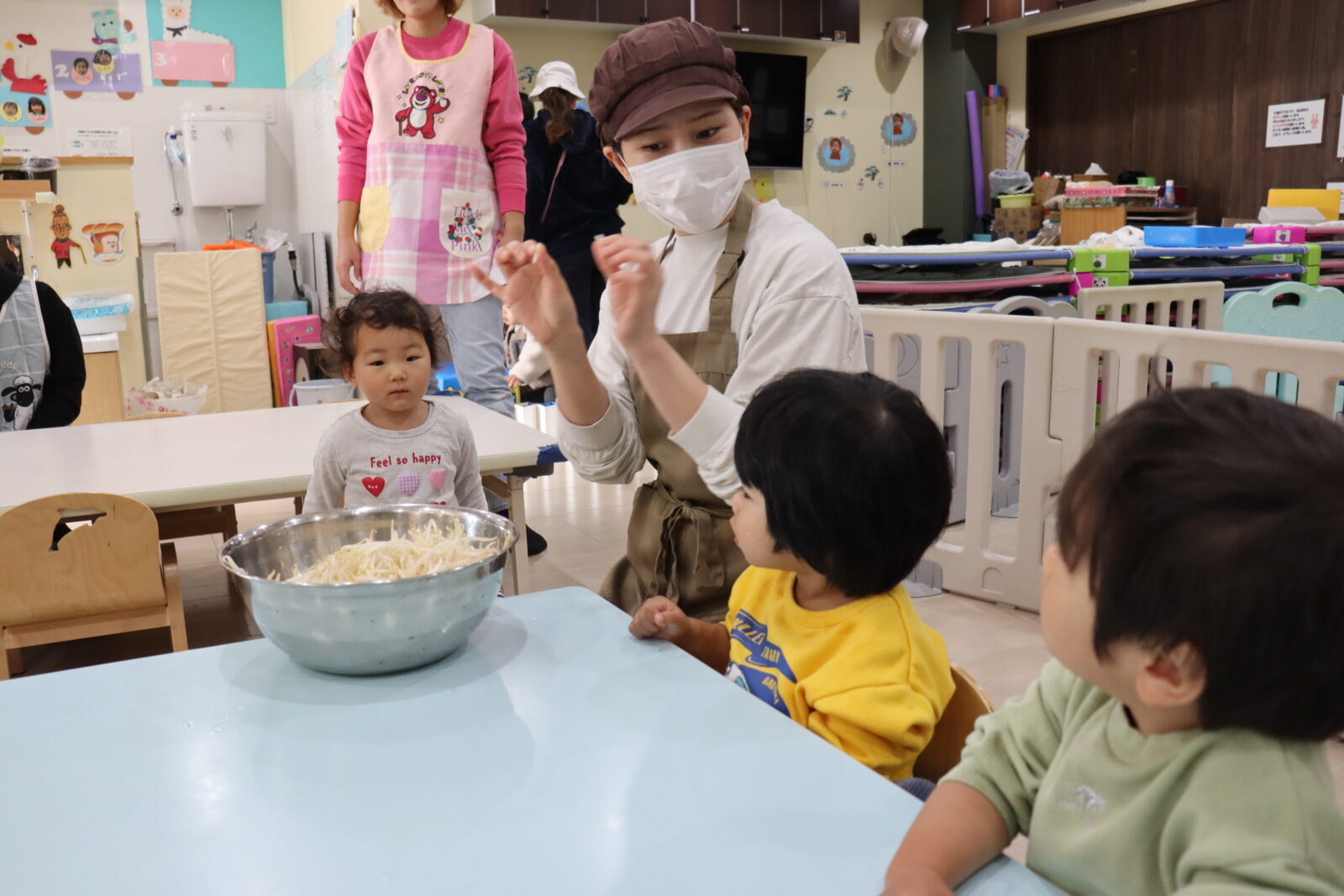 りす組さんの食育の様子です🐿 この日はもやしちぎりをしてました🎵 細くてながいね~✨ 折るとパキっと